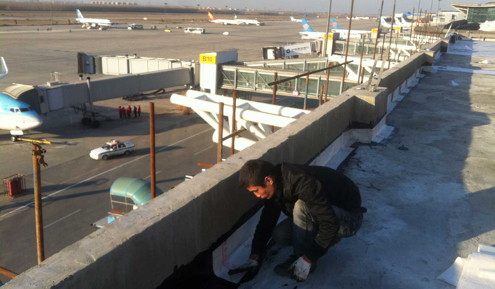 国建精材深耕工程防水领域20 年,凭借深厚的技术沉淀与丰富的项目经验,可承接全场景大型防水工程,业务范围覆盖机场防水、车站防水、隧道堵漏、地下车库防水、水上乐园防水、桥面防水等,从交通枢纽到地下空间,从游乐设施到市政基建,全方位解决各类复杂防水需求。此次,国建精材成功承接辽宁沈阳桃仙机场屋面防水工程,针对机场屋面面积大、节点复杂及北方低温多温差的气候特点,选用非固化橡胶沥青防水涂料作为核心防水材料,构建长效可靠的屋面防水体系,为机场安全运营筑牢防水屏障。