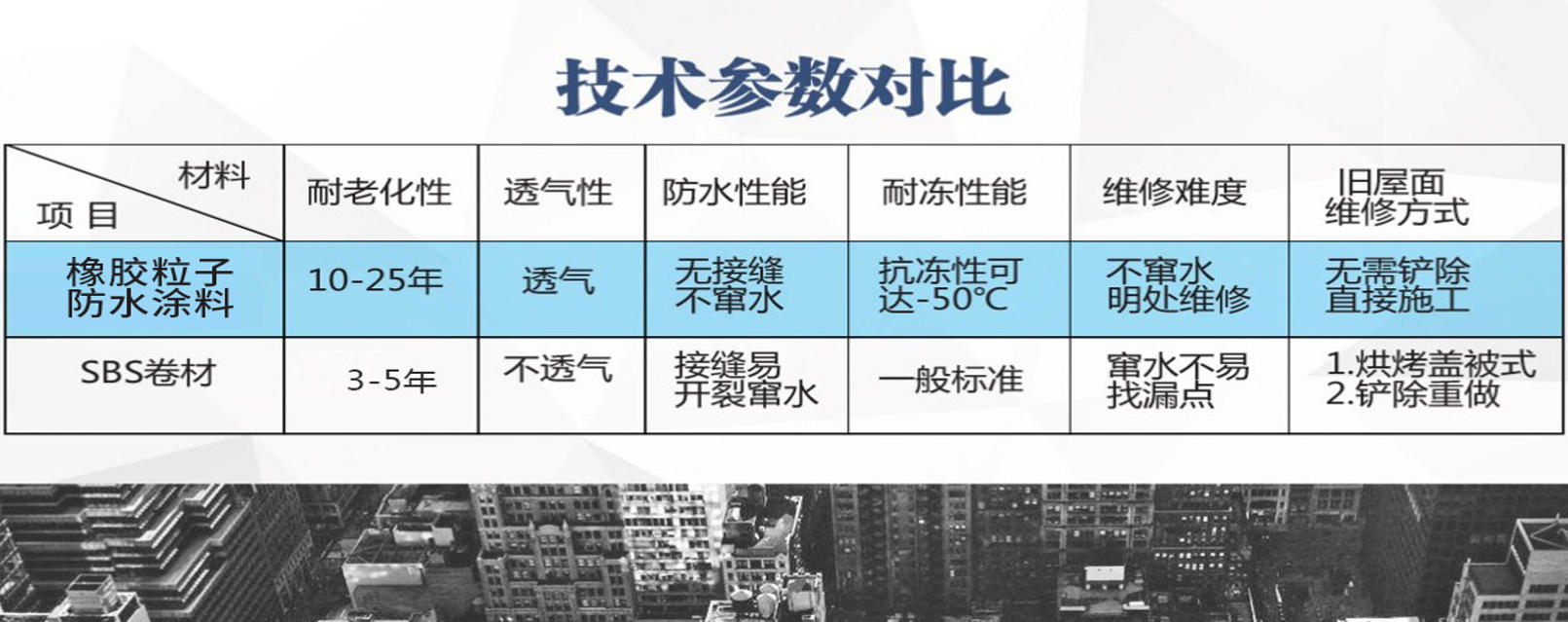 主要用于屋面防水,替代传统SBS卷材,卫艺家水性橡胶粒子适合旧屋面防水维修,施工简便,具有耐老化性能优良、透气不透水、粘结力强等特点